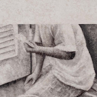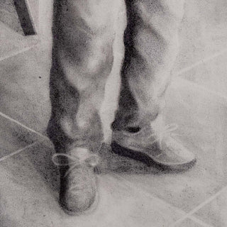 Pablo Matute’s work explores the intersection of materiality and representation, bringing a raw, tactile quality to traditional drawing techniques. In this piece, a meticulously rendered hand grips a sharply defined object, creating a striking contrast between the organic and the geometric. The choice of charcoal on cement enhances the tension between fragility and permanence, evoking themes of communication, creation, and the human relationship with tools. The gestural pose hints at both contemporary digital habits and timeless artistic traditions, inviting reflection on the way we shape and are shaped by our mediums.